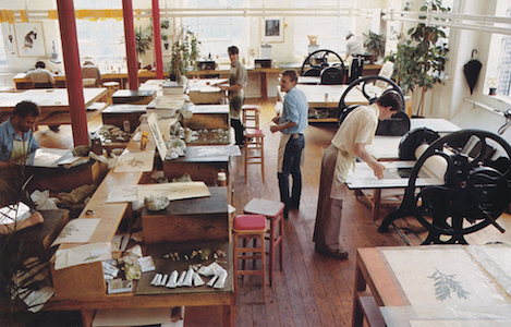 A Master printmaker, Richard has editioned work for many contemporary artists, including David Hockney, Robert Ryman, Francesco Clemente, Donald Sultan and Keith Haring. In 1977 he worked with David Hockney as his assistant, setting up an etching studio for him. It was an interesting time as Richard was able to watch Hockney at work on his sets for the Glyndebourne 'Magic Flute'. In 1988 Richard spent several months in New York working with Jasper Johns, proofing and editioning complex carborundum prints.